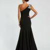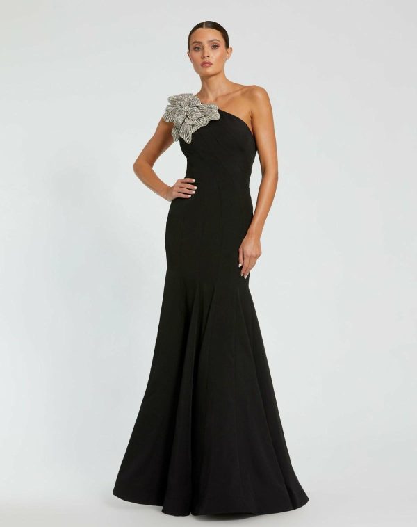 Captivate effortlessly in this crepe one shoulder gown. Featuring a sleek one-shoulder design and trumpet silhouette, this gown exudes elegance and allure.
