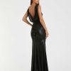 Crafted from sleek jersey fabric, this gown features a high neckline, cowl open back, and a cascading ruffle detail.