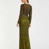 Long sleeve evening gown with a high bead-accented neckline, fitted bodice, illusion yoke and sleeves, and a floor-length mermaid skirt with a sweeping hem. The mesh overlay is adorned with beads and sequins placed in an abstract pattern. A hand-beaded belt accents the natural waist.
