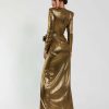 This Metallic Jersey Long Sleeve Gown is crafted from shimmering charmeuse fabric, making it perfect for a glamorous event. The long sleeves provide coverage while the thigh high slit adds a touch of sensuality. Finished with a bow detail, this gown exudes elegance and sophistication.