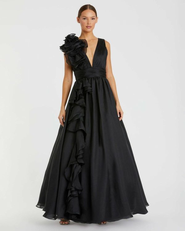 V-neck sleeveless ball gown with ruffled shoulder ruched empire waist and ruffles flowing down the skirt.