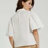 Shop our Cotton Flare Ruffle Sleeve Button-Up Top. Combining comfort and style, this versatile piece features flared ruffle sleeves and a classic button-up design. Perfect for any occasion, it pairs seamlessly with jeans, skirts, or trousers for an effortlessly chic look.