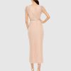 Crafted from hand-embellished fabric, this beaded dress features a faux wrap bodice, short sleeves, and a back vent.