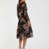 This v-neck cocktail dress features sheer illusion sleeves and bodice, an a-line tea-length skirt, and sequined floral embellishments throughout. The neckline, sleeve cuffs, and natural waistline are accented with black velvet trim.