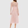 - Partially lined bodice; fully lined through skirt; sheer unlined sleeves