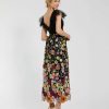 This dress features a flattering V-neckline and delicate ruffled flutter sleeves, adding a touch of elegance. Hand-stitched floral appliqués are featured throughout the skirt, bringing a whimsical touch.