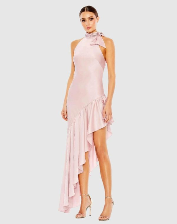 Introducing our Halter Neck Ruffled Asymmetrical Gown—an exquisite blend of elegance and drama. With its halter neckline and cascading ruffles, this gown is a stunning choice for any formal event. The asymmetrical hemline adds a contemporary flair, while the halter neck offers a touch of sophistication.