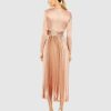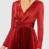 This captivating ensemble features a classic deep V-neckline and graceful long sleeves. Delicate pleats adorn the fabric, adding texture and dimension to the sophisticated silhouette. Crafted from high-quality material, this dress offers both comfort and style, making it an essential addition to your wardrobe for any formal affair.