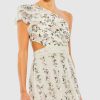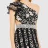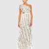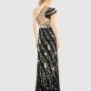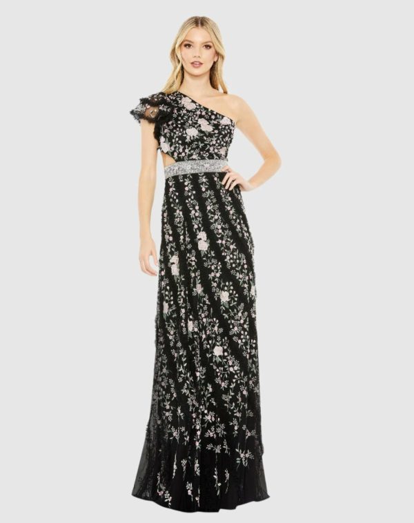 Our Embroidered Ruffled One Shoulder Lace Up Gown is a masterpiece of elegance and sophistication. Featuring an embroidered mesh overlay with a fully lined bodice and skirt, it boasts a striking asymmetrical neckline and a single ruffled cap sleeve. The lace-up open back adds drama, while the floral beaded waist detail and hand-stitched sequins offer a touch of glamour.