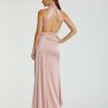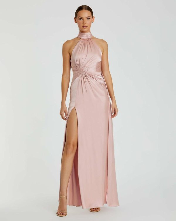 Experience sophistication in this stunning Open Back High Neck Side Ruched Gown. Crafted from luxurious satin fabric, it features a halter neckline, ruched waist detailing, and a thigh-high slit, making it the perfect gown for any special occasion.