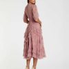 - Partially lined bodice; fully lined skirt; sheer unlined sleeves