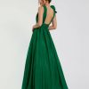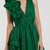 V-neck sleeveless ball gown with ruffled shoulder ruched empire waist and ruffles flowing down the skirt.