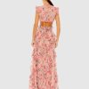 This gown features a flattering V-neckline and elegant cap sleeves with charming ruffle detailing. The cut-out design adds a modern touch, creating a captivating look. Perfect for weddings or formal occasions.