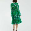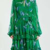 Mac Duggal Every Day Dresses | Green Printed Chiffon Bishop Sleeve Tie Waisted Ruffle Midi Dress Green Multi Women