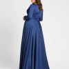 Classic satin evening gown with plunging v-neckline, long sleeves and thigh-high slit.