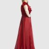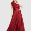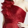 One-shoulder evening gown with dramatic ruffle detailing and ruched bodice.